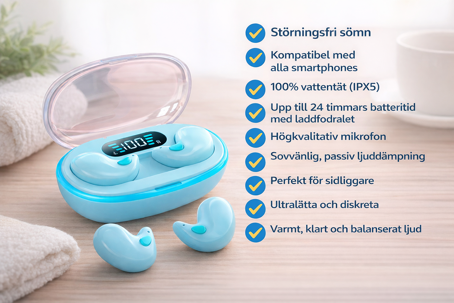 De ultralätta och diskreta hörlurarna är utformade för maximal komfort och väger endast 2 gram per styck, vilket gör att de knappt märks i öronen. Trots sin kompakta storlek levererar de ett varmt, klart och balanserat ljud som kan mäta sig med betydligt dyrare hörlurar. Den bekväma passformen gör att du kan använda dem natt efter natt utan att känna obehag – som om du inte bar något alls.