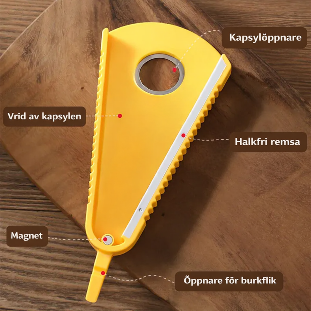 Denna allt-i-ett-öppnare klarar sex olika typer av lock och förseglingar. Den öppnar burkar, kapsyler, dragflikar och säkerhetsförseglingar med lätthet – ett enda verktyg som ersätter flera.
